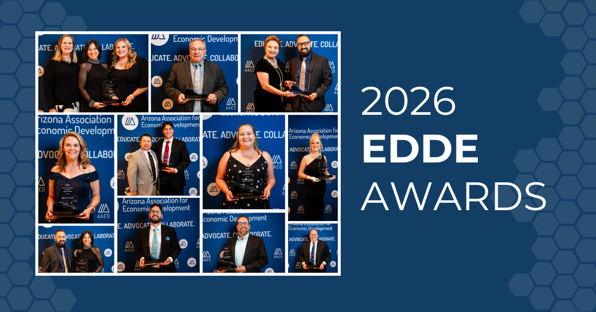 PHOENIX, ARIZ. (April 21, 2026) — The Arizona Association for Economic Development (AAED) presented its annual Economic Development Distinguished by Excellence (EDDE) Awards during its Spring Conference at the El Conquistador Resort in Oro Valley, Arizona.